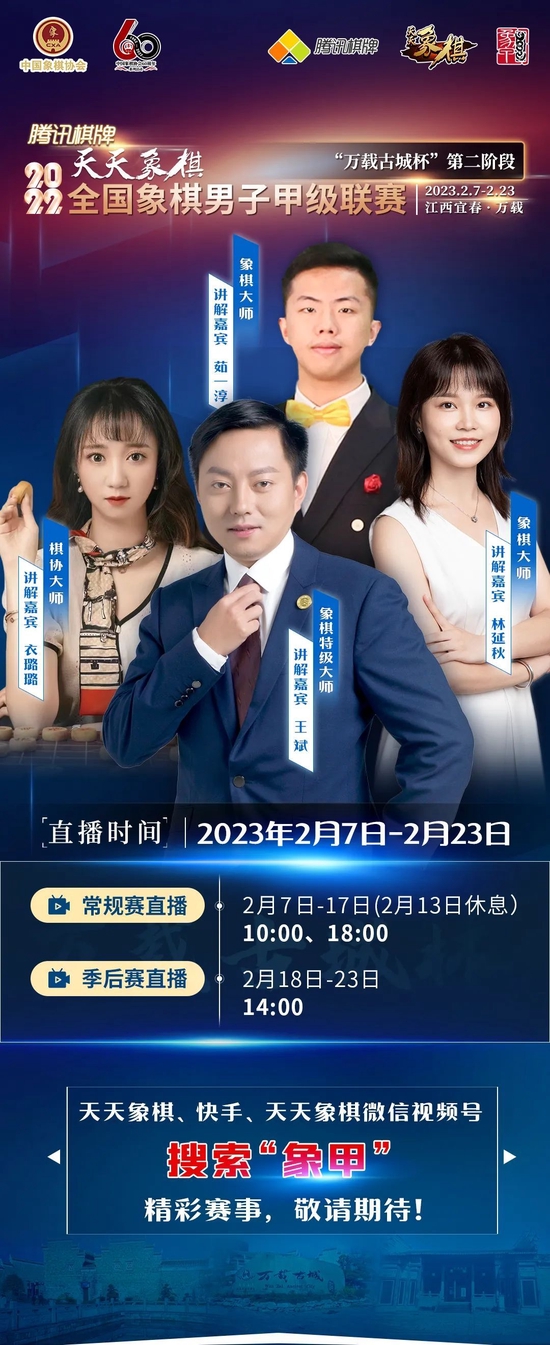 2023年2月22日,“腾讯棋牌 天天象棋”2022寰球象棋须眉甲级联赛总决赛在江西宜春万载县山水迎宾馆打响。