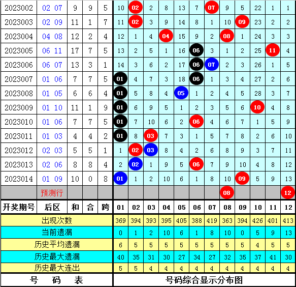 1、后区和值分析:在第015期历史同时奖号中,后区和值分辨为:23-15-7-18-4-14-12-12-15-12-3-16-10-10-8-17,和值012路比为7:5:4,奇偶比为6:10,大小比为7:9,本年第015期看好出现偶数和值,暖和和值20。